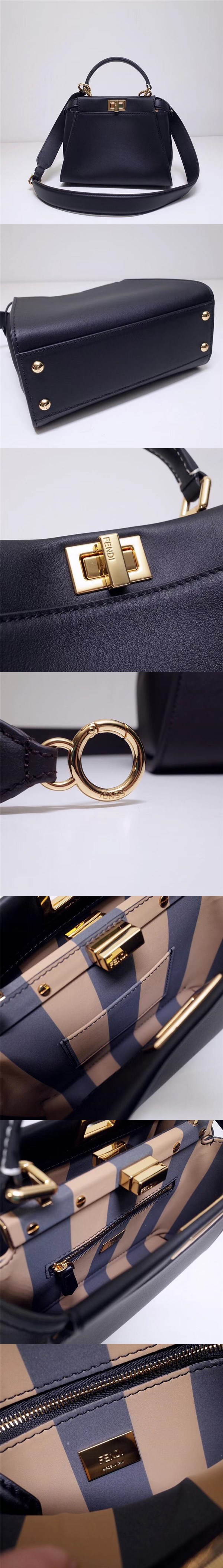 高仿芬迪Fendi小牛皮手袋原色硬隔板分隔出兩個隔層,配以電鍍索環和飾條。單手柄、金色轉鎖開合和金屬配飾,可調節可拆卸肩帶,內置拉鏈口袋,款號:6079