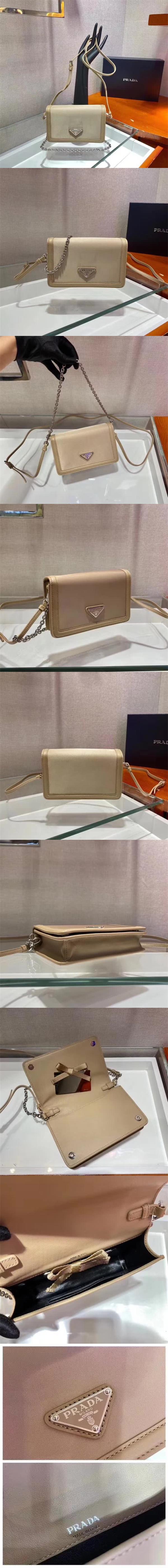普拉達/Prada 斜挎包,一包兩用,采用進口尼龍佈料搭配小牛皮,小牛皮長肩帶可拆卸設計,鐵鏈妙變成腋下包,所有衣服都可以搭配上,內配金屬五金鏡子,輕便又實用,款號:1BP019【編號】1BP019#B039【顏色】卡其色【尺寸】18 X 12 X 3 cm【規格】翻蓋開合皮革襯裡內貼袋3個卡槽可拆卸可調節肩帶可拆卸鏈條肩帶【附屬品】防塵袋