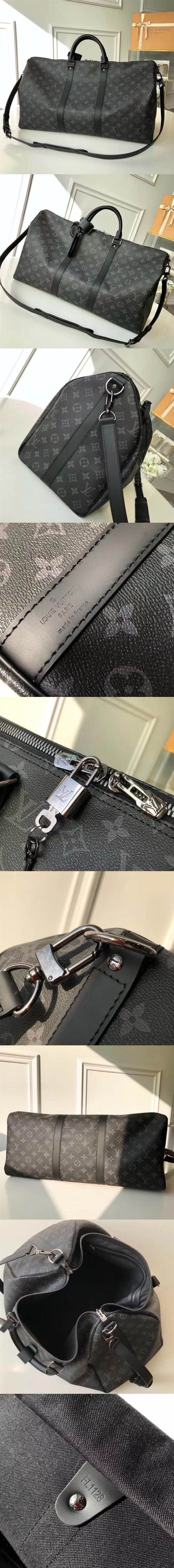 【高仿】路易威登/LV KEEPALL 45 旅行袋,由全新標志性黑灰 Monogram Eclipse 帆佈裁制而成,配有提握舒適的皮革手柄,一條適用於閑適斜挎的包帶以及一個閃亮的掛鎖,短途旅行的伴侶,款號:M40569