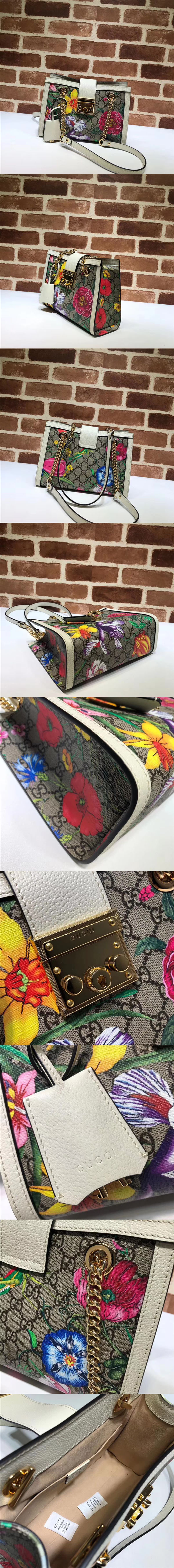 古馳/Gucci Padlock 系列花卉肩背包,將品牌兩種富有辨識度的設計巧妙交融,形成一種出人意料的時尚面料,為這經典單品註入別樣魅力,經典花卉圖案迭加在品牌雙G字母交織圖案之上,同時搭配皮革滾邊,讓兩種經典圖案煥發時尚風情,款號:498156【編號】498156#G075【顏色】白色【尺寸】26 X 18 X 10 cm【規格】鎖扣開合超細纖維襯裡內貼袋鏈條肩帶【附屬品】防塵袋