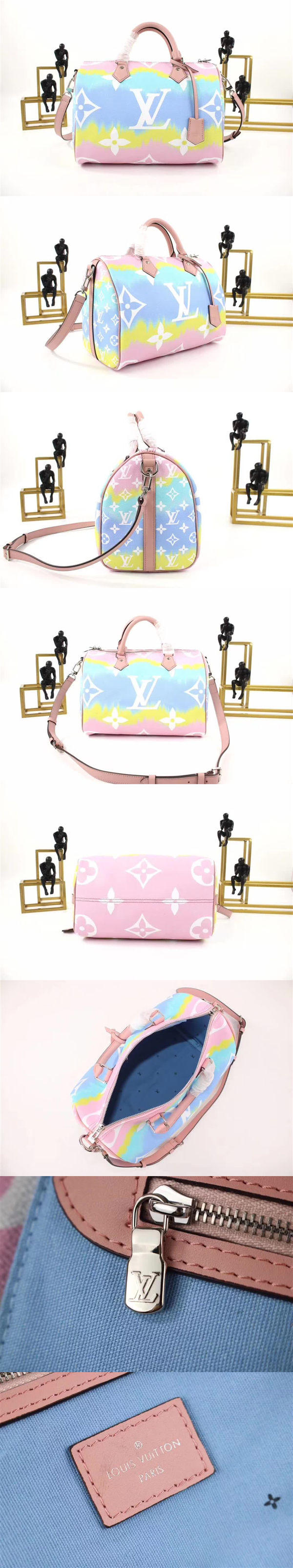 路易威登/LV Speedy Bandoulière 30 手袋,於 Escale 系列再展新顏,紮染 Monogram 帆佈洋溢海灘風情,軋制皮革手柄、標志性線條與銘紋掛鎖凸顯傳承意味,款號:M45123【編號】M45123#L027【顏色】粉色【尺寸】30 X 21 X 17 cm【規格】皮革手柄拉鏈開合棉麻襯裡內貼袋拉鏈袋可拆卸可調節肩帶【附屬品】防塵袋