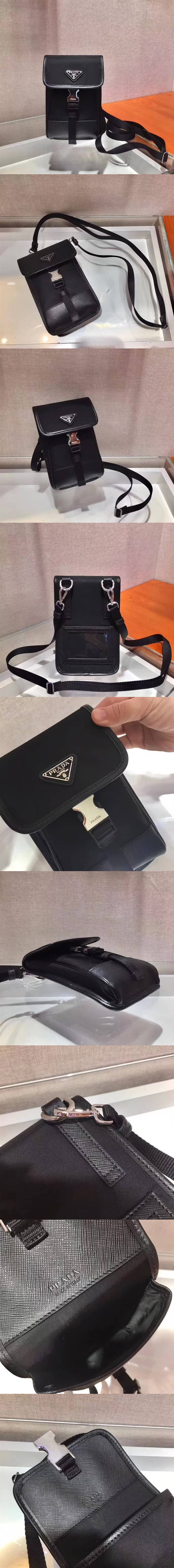 【高仿】普拉達/Prada 手機包,選用尼龍材質搭配Saffiano皮革飾邊,玲瓏有致,金屬旁開扣和塗琺瑯三角形徽標平添別致格調,款號:2ZH109