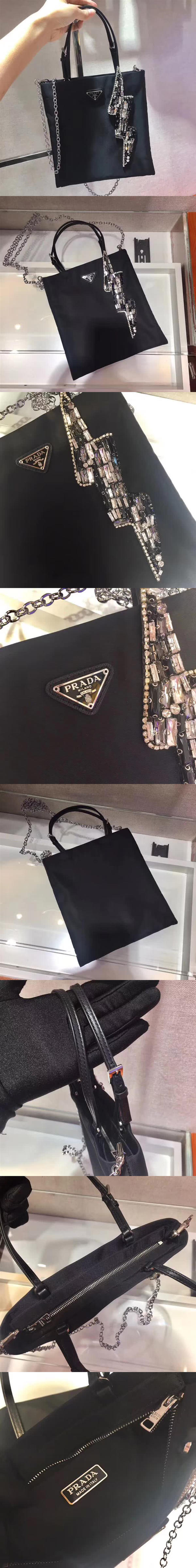 高仿普拉達/Prada 手袋,采用進口尼龍佈料搭配小牛皮裁制而成,點綴純手工拼成的閃電水鉆,亮閃閃的外表 在燈光下blingbling的效果非常吸睛 ,回頭率特高,款號:1BA253