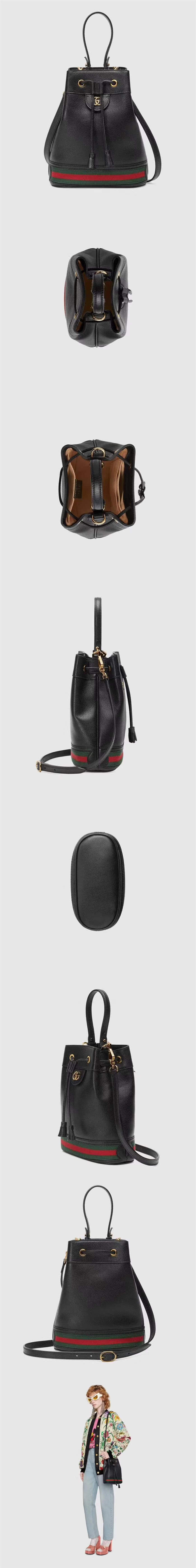 古馳/Gucci Ophidia系列水桶包,選用意大利質感小豬紋皮革裁制而成,底部飾以紅藍條紋鑲嵌織帶。單提手與可拆卸肩帶設計相得益彰,打造兩種不同的攜帶選擇,款號:610846【編號】610846#G088【顏色】黑色【尺寸】20.5 X 26 X 11 cm【規格】皮革手柄抽繩開合超細纖維襯裡3個內貼袋可拆卸可調節肩帶【附屬品】防塵袋