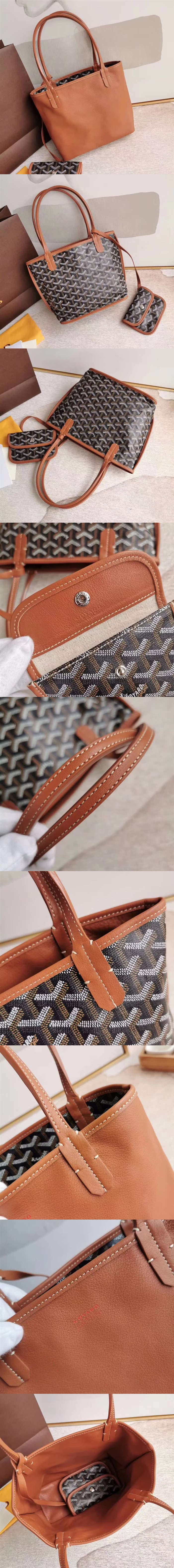 Goyard戈雅 Mini anjor 雙面tote包,選用品牌獨有的帆佈面料搭配小牛皮裁制而成,牛皮的一面是正面,logo這邊是反面【編號】D023【顏色】棕色【尺寸】29 cm【規格】雙皮革提手可拆卸零錢袋正反兩面可用【附屬品】防塵袋