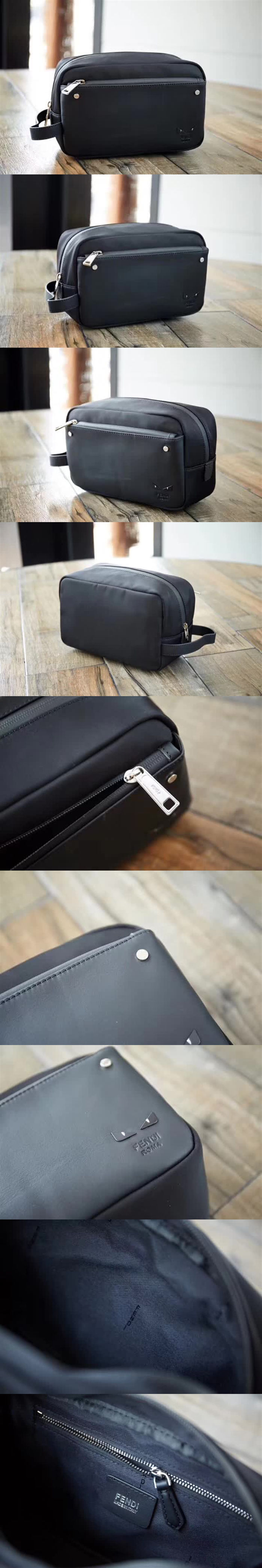 高仿芬迪/Fendi 手包,選用進口尼龍材質搭配小牛皮精心裁制而成,飾以黑色緞面金屬小飾件構成的BAG BUGS眼睛圖案,細節清晰可見
