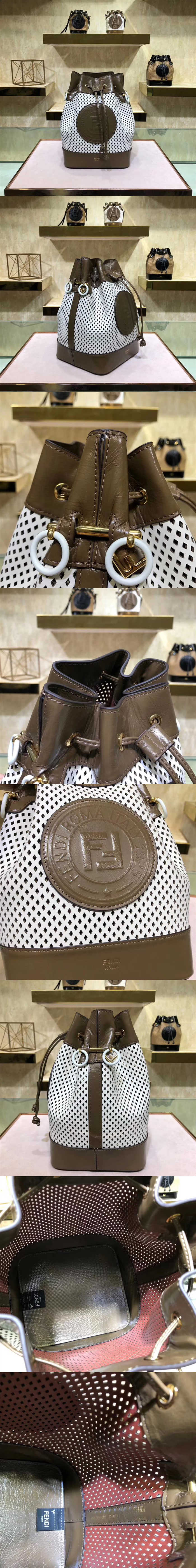 芬迪/Fendi Mon Tresor水桶手袋,選用小牛皮鏤空設計精心裁制而成,復古風潮引領時尚,減齡神器款,款號:9318【編號】9318#A359【顏色】白/棕【尺寸】18 X 12 X 10 cm【規格】束繩收縮開合皮革裡襯可拆卸肩帶【附屬品】防塵袋
