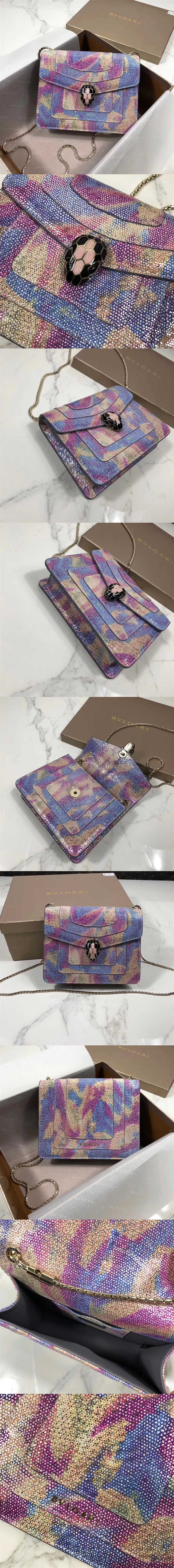 寶格麗/Bvlgari 鏈條包20,選用進口蛇皮,內裡小羊皮裁制而成,點綴塗層琺瑯蛇首形,更像一件藝術品,款號:34559【編號】34559#C028【顏色】彩色【尺寸】20 X 15 X 5 cm【規格】塗層琺瑯蛇首形皮革襯裡1個卡槽蛇骨圓形鏈條肩帶【附屬品】防塵袋