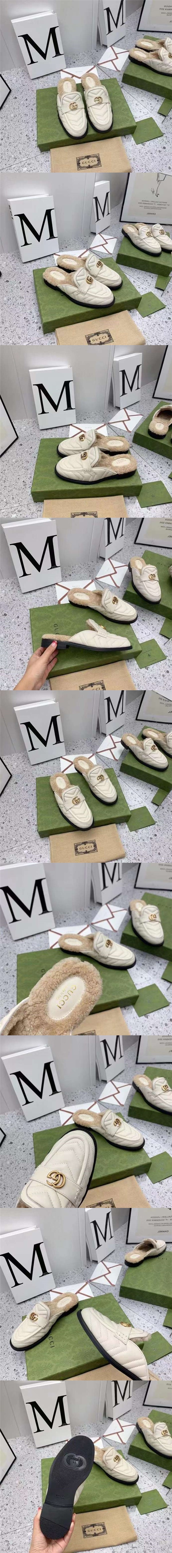 高仿古馳Gucci雙G扣V型紋繡毛拖,相當有質感 ,全粒面古軟皮,羊皮裡 皮毛一體羊羔毛
