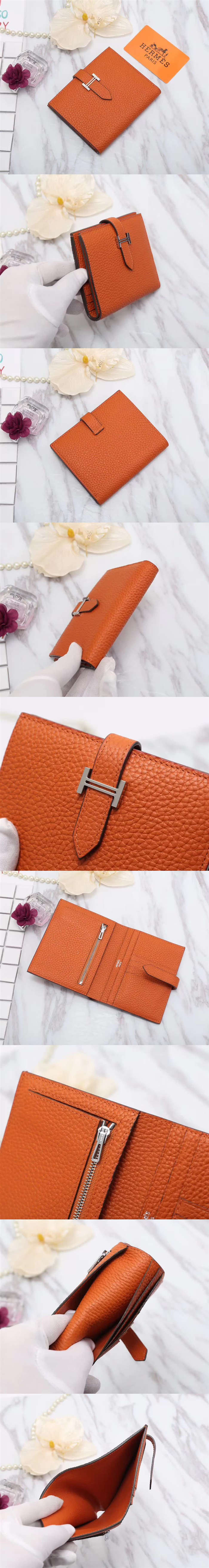 愛馬仕/Hermes Bearn 短錢夾,選用荔枝紋小牛皮精心裁制而成,飾以 H 鎖扣,精致優雅,易搭又好看【編號】J049【顏色】橙色【尺寸】12 X 10 cm【規格】銀色 H 鎖扣對折開合1個鈔票隔層1個拉鏈袋4個側貼袋4個卡槽【附屬品】防塵袋