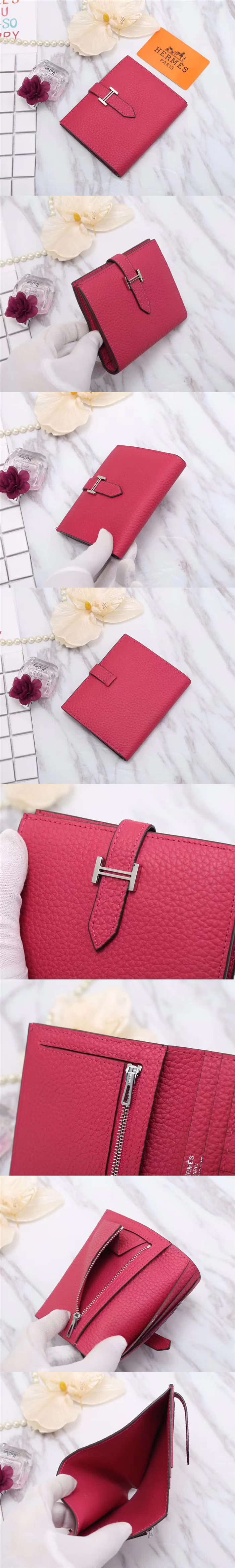 愛馬仕/Hermes Bearn 短錢夾,選用荔枝紋小牛皮精心裁制而成,飾以 H 鎖扣,精致優雅,易搭又好看【編號】J049【顏色】玫紅色【尺寸】12 X 10 cm【規格】銀色 H 鎖扣對折開合1個鈔票隔層1個拉鏈袋4個側貼袋4個卡槽【附屬品】防塵袋