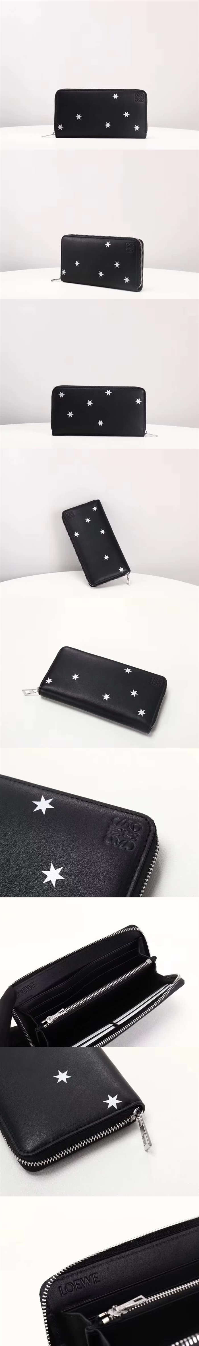 羅意威/Loewe 長款錢夾,選用經典小牛皮精制而成,銀色六芒星運用皮革鑲嵌工藝粘貼,閃耀在黑色包身上,宛如群星璀璨的夜空,完美演繹精湛工藝,款號:281703【編號】281703#C025【顏色】黑色【尺寸】19 X 11 X 2.5cm【規格】拉鏈開合2個鈔票隔層8個卡槽1個拉鏈袋2個側貼袋【附屬品】防塵袋