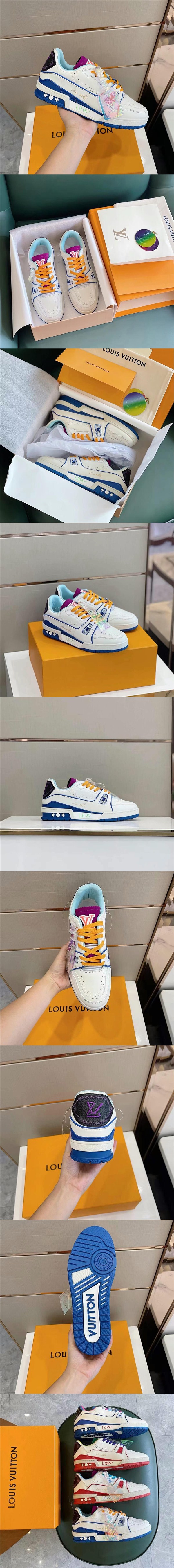 高仿LV最新款Trainer運動休閑鞋,以素面皮革和小牛皮制成的麂皮碰撞醒目反差,搭配透明行李牌,潮男必備單品!