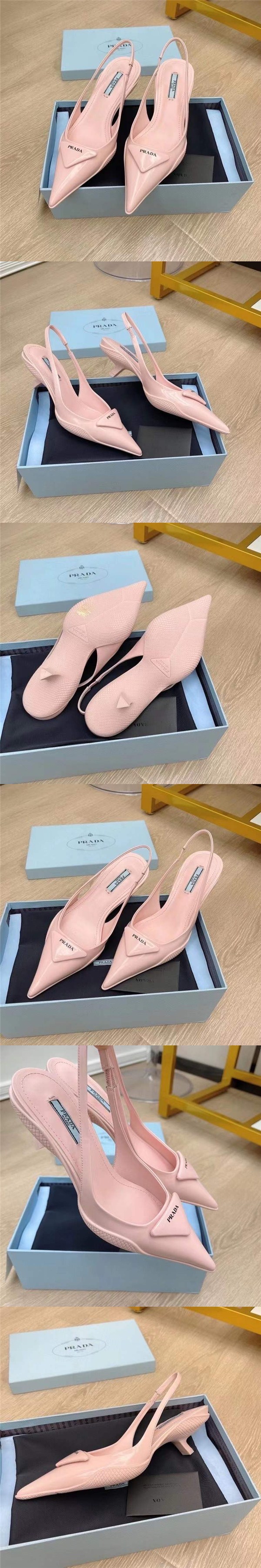 普拉達Prada新款後空三角標貓跟涼鞋,這款亮面皮革後飾帶高跟鞋的橡膠隔層鞋底包裹鞋幫,營造出融柔美的尖頭廓形和運動元素於一身的混搭格調。別出心裁的逗號跟彰顯復古風情。於此款鞋履上化身為微襯皮革細節,為品牌傳統元素註入新活力