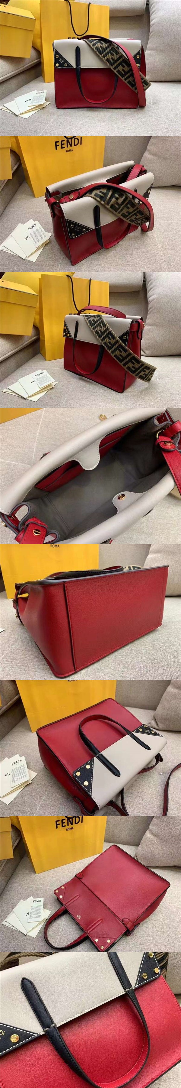 高仿芬迪Fendi小牛皮手袋原色硬隔板分隔出兩個隔層,配以電鍍索環和飾條。單手柄、金色轉鎖開合和金屬配飾,可調節可拆卸肩帶,內置拉鏈口袋,款號:6079