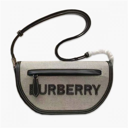 高仿巴寶莉/Burberry 肩背包,時裝秀款,精選印有徽標圖案的牛仔佈面料打造,並以緝明線皮革匠心包邊。弧形曲線的設計靈感源自品牌時裝秀場館倫敦奧林匹亞展覽中心。款號:80397791