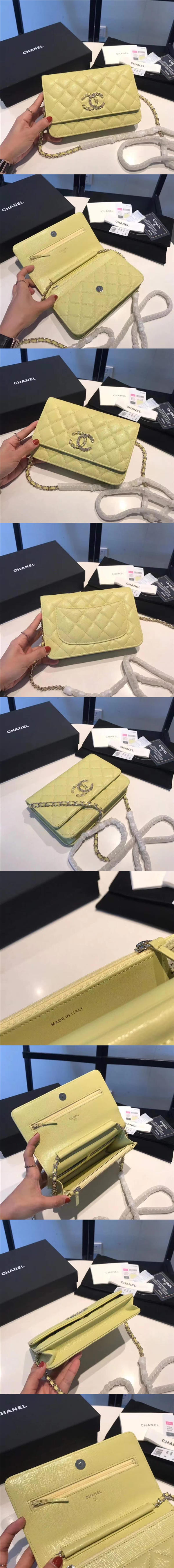 香奈兒/Chanel woc 發財包,荔枝細球紋牛皮材質,logo亮眼獨特洋氣,一半穿皮一半穿金鏈條設計,精致又特別,12個顏色【編號】A096【顏色】如圖所示【尺寸】19 cm X 12.5 cm【規格】翻蓋開合織物襯裡1個拉鏈袋6個卡槽【附屬品】防塵袋