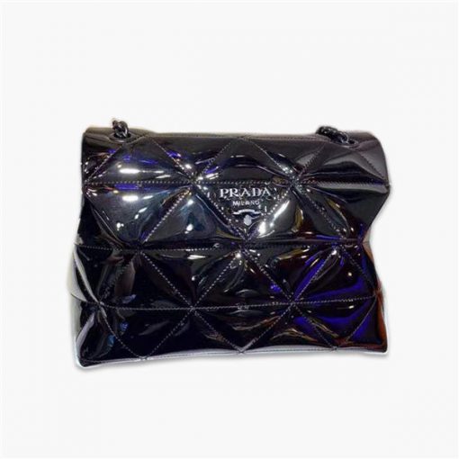 【高仿】普拉達/Prada Spectrum 漆皮手袋 采用標志性的亮面皮革制作,飾有間面線營造出的幾何圖案,頗為別致,一枚同色金屬刻字徽標閃耀於包身,綻現品牌格調,款號:1BD231