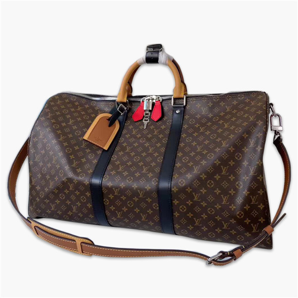 高仿路易威登/LV Keepall Bandouliere 50旅行袋,Monogram Eclipse帆佈包身搭配品牌卷標圖案,機艙行李尺寸內含充裕空間,與紳士優雅隨行,款號:M45988