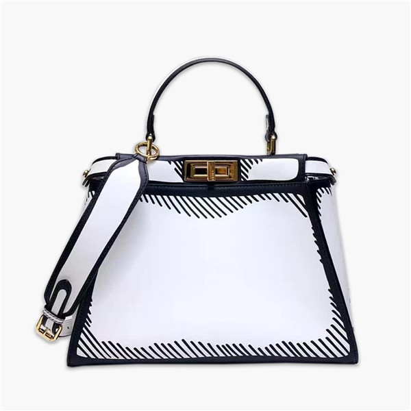 高仿芬迪/Fendi Iconic Peekaboo手袋,白色皮革材質,以對比鮮明的黑色圖形輪廓為特色,營造出二維效果,兩側則綴以經典的扭鎖,內襯飾有黑色圖形輪廓,構成FF圖案