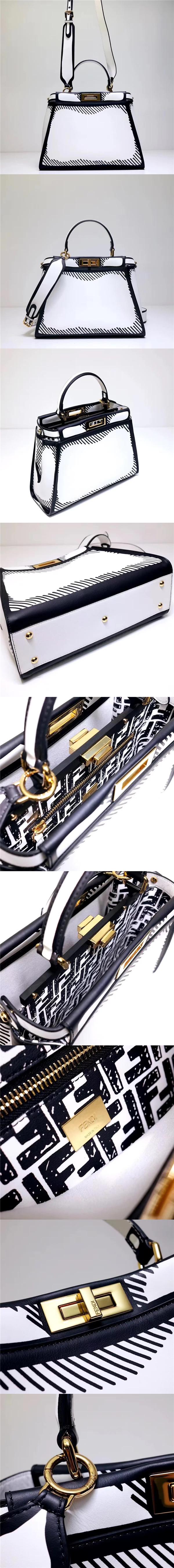 【高仿】芬迪/Fendi Iconic Peekaboo手袋,白色皮革材質,以對比鮮明的黑色圖形輪廓為特色,營造出二維效果,兩側則綴以經典的扭鎖,內襯飾有黑色圖形輪廓,構成FF圖案