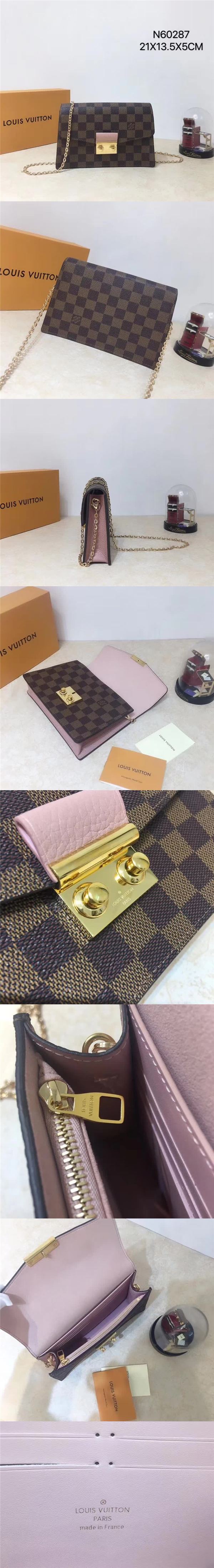 路易威登/LV Croisette 鏈條包,融合 Damier Ebene 帆佈與彩色皮革,點綴硬箱傳承至今的 S-lock 鎖扣,展現標志性設計理念,款號:N60287【編號】N60287#J001【顏色】啡格/粉【尺寸】21 X 13.5 X 5cm【規格】翻蓋開合超細纖維襯裡內貼袋拉鏈袋6個卡槽鏈條肩帶【附屬品】防塵袋
