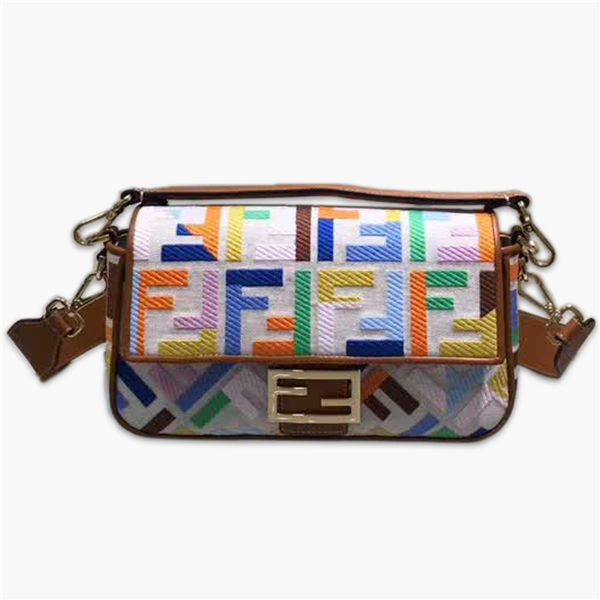 高仿芬迪/Fendi Baguette 手袋,選用提花佈料材質精心裁制,飾有彩色FF圖案刺繡,采用翻蓋設計,配有FF磁扣,配備可拆卸肩帶