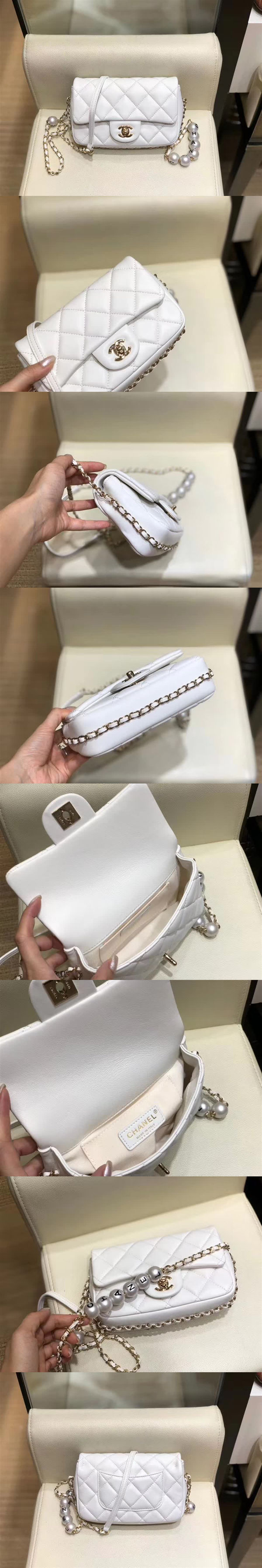 【高仿】香奈兒/Chanel CF Mini 手袋,選用小羊皮搭配珍珠穿鏈肩帶,比方胖子大一點容量剛剛好,New 鏈條長度單肩或斜挎也是十分協調,主要是細帶子比較輕,珍珠質感一點也不會顯重,小羊皮外觀更美更高級