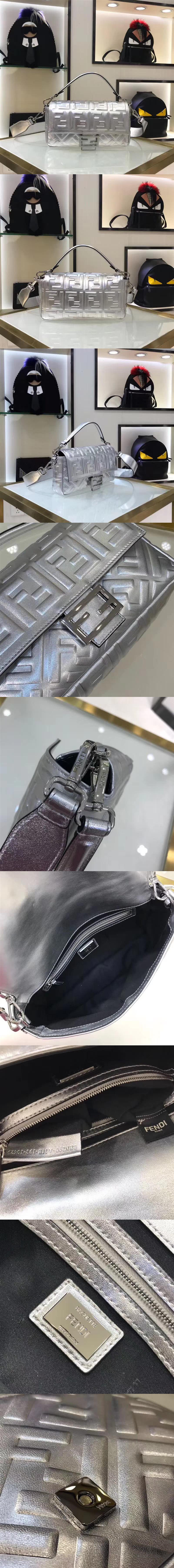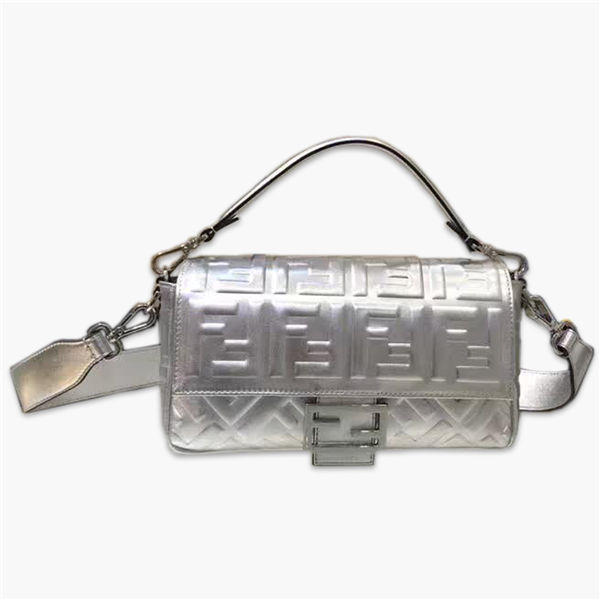 芬迪/Fendi Baguette 手袋,選用鏡面效果皮革材質精心裁制,飾有FF壓花圖案,采用翻蓋設計,配有FF磁扣,配備可拆卸肩帶,可手提或斜挎【編號】B062【顏色】銀色【尺寸】26 X 15 X 6 cm【規格】可拆卸提手翻蓋開合織物襯裡內拉鏈袋可拆卸肩帶【附屬品】防塵袋