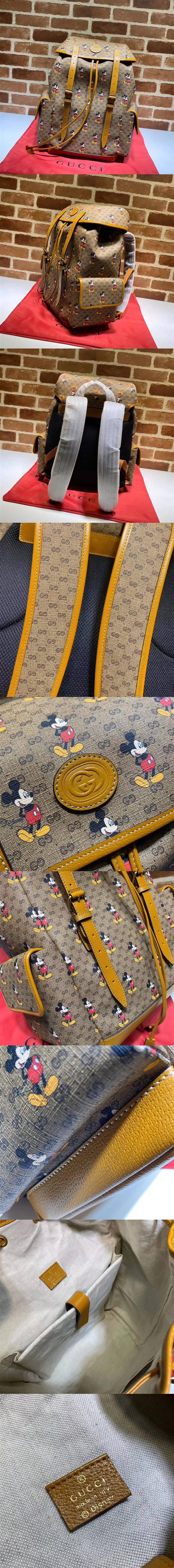 【高仿】古馳/Gucci 米奇雙肩包,趣味盎然的米奇形象為這款GG帆佈背包增添靈動之氣,淺棕色皮革滾邊細節則營造出復古感,為致敬中國新年,富有傳奇色彩的迪斯尼經典形象以彩色印花、刺繡貼飾或提花圖案的形式亮相,款號:603898