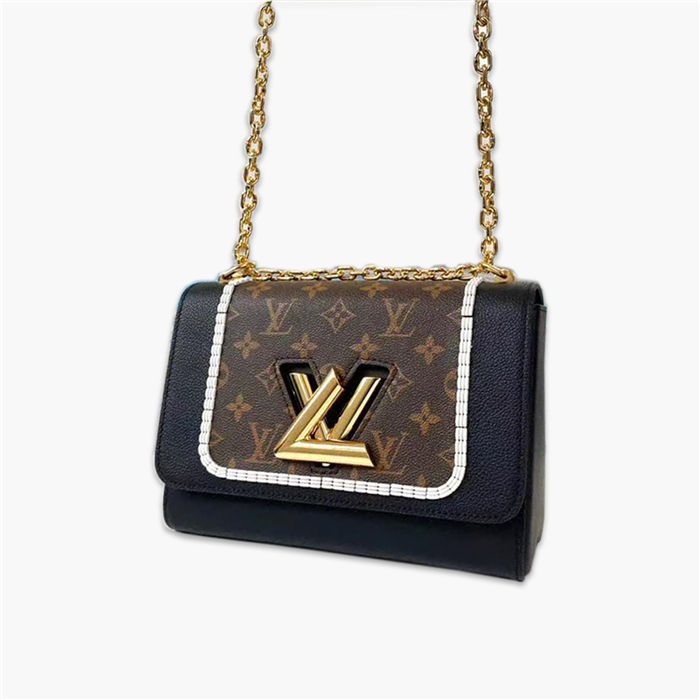 路易威登/LV Twist 手袋,選用 Monogram 帆佈翻蓋勾勒立體感編織飾邊,投身 Monogram 愛好者懷抱,Twist 扭鎖及滑鏈與素雅色調碰撞反差,款號:M44837【編號】M44837#L068【顏色】黑色【尺寸】23 X 17 X 9.5 cm【規格】翻蓋開合超細纖維襯裡鏈條肩帶【附屬品】防塵袋