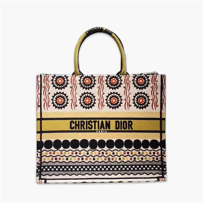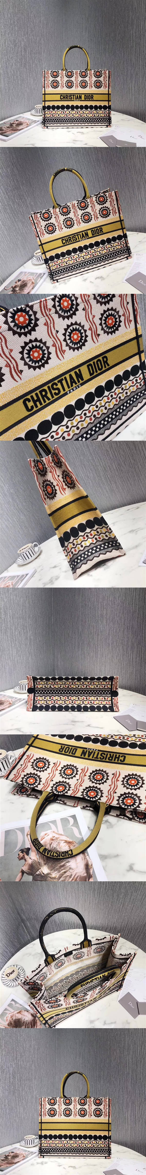 迪奧/Dior Book tote 購物袋,采用通體刺繡帆佈精制而成,整個包以繽紛色彩圖案設計,為盛夏造型增添閑適氣息,相互碰撞出獨特的絢爛效果,每隻手袋歷時三十二個工時以上,包含三種不同的刺繡針法,由一百二十萬針縫線精制而成,款號:M1286【編號】M1286#D301 【顏色】彩色【尺寸】41.5 X 32 X 5 cm【規格】頂部手柄無襯裡【附屬品】防塵袋