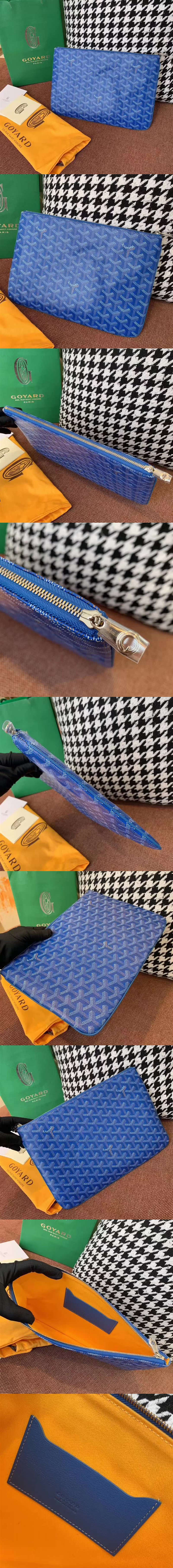 Goyard戈雅 手拿包,選用品牌獨有的帆佈面料飾以皮革包邊裁制而成,配色經典,做工精致,老花紋也特別耐看【編號】D023【顏色】藍色【尺寸】30 cm【規格】拉鏈開合帆佈內襯內貼袋銀色五金配件【附屬品】防塵袋