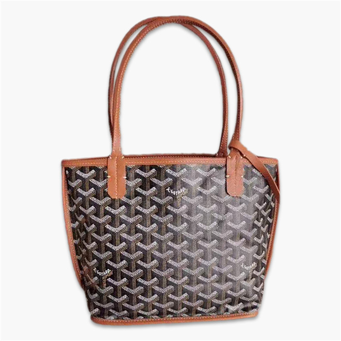 Goyard戈雅 Mini anjor 雙面tote包,選用品牌獨有的帆佈面料搭配小牛皮裁制而成,牛皮的一面是正面,logo這邊是反面【編號】D023【顏色】棕色【尺寸】29 cm【規格】雙皮革提手可拆卸零錢袋正反兩面可用【附屬品】防塵袋