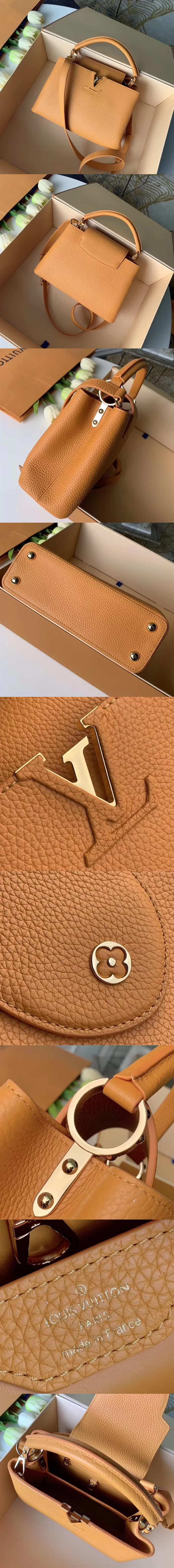 高仿路易威登/LV Capucines手袋,選用全粒面 Taurillon 皮革裁制而成,結合瞭精致優雅的細節設計,包括硬度適中的手柄,連接手柄的華麗扣環,款號:M94586