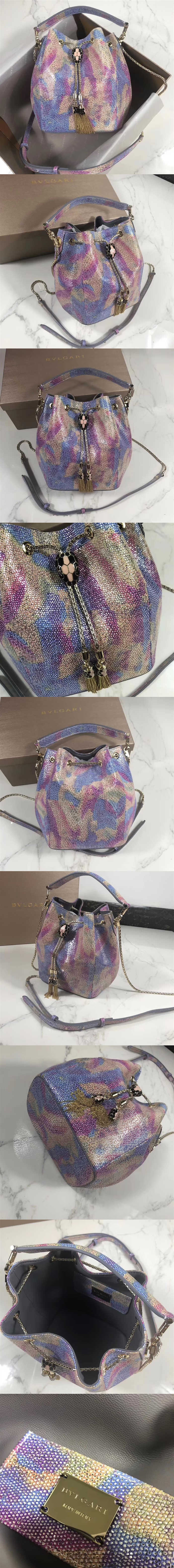 高仿寶格麗/Bvlgari 水桶包,選用水蛇皮搭配小羊皮襯裡裁制而成,點綴彩色琺瑯蛇首形鎖扣,收縮自如,眾多歐美大牌街拍必備款,款號:B287614