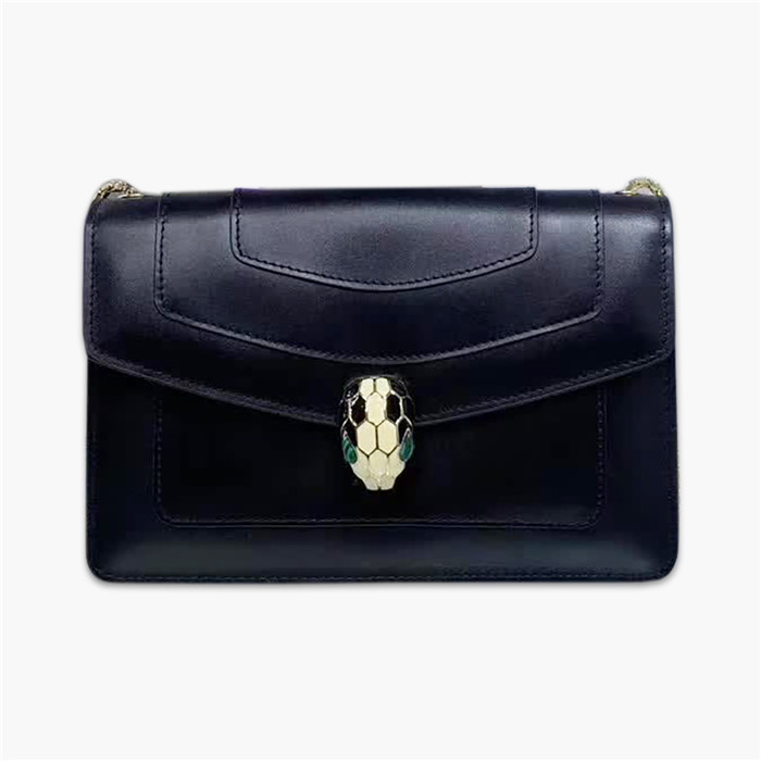 高仿寶格麗/Bvlgari 鏈條包22,選用進口小牛皮裁制而成,點綴彩色琺瑯蛇首形搭扣,雙眼鑲嵌孔雀綠松石,不僅僅是優雅,更是張揚的野性,款號:39174