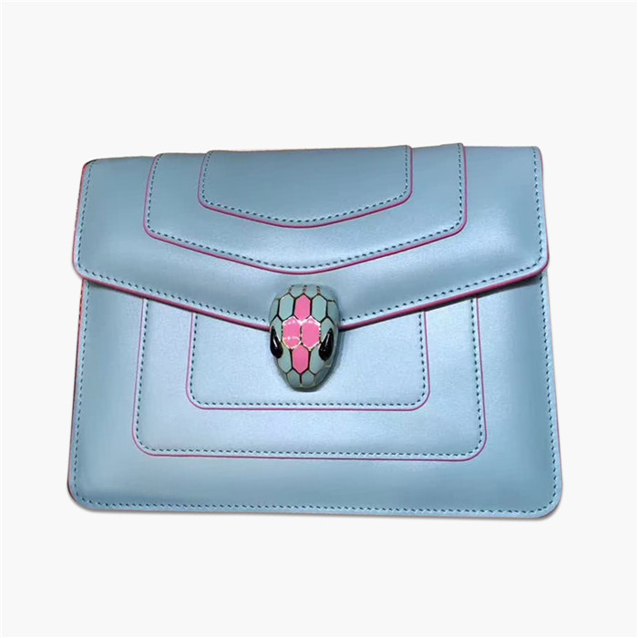 寶格麗/Bvlgari 鏈條包20,選用進口牛皮裁制而成,簡約時尚,奢華低調,輕巧方便,款號:34559【編號】34559#C028【顏色】淺藍色【尺寸】20 X 14 X 4.5 cm【規格】塗層琺瑯蛇首形翻蓋開合織物襯裡內貼袋蛇骨圓形鏈條肩帶【附屬品】防塵袋