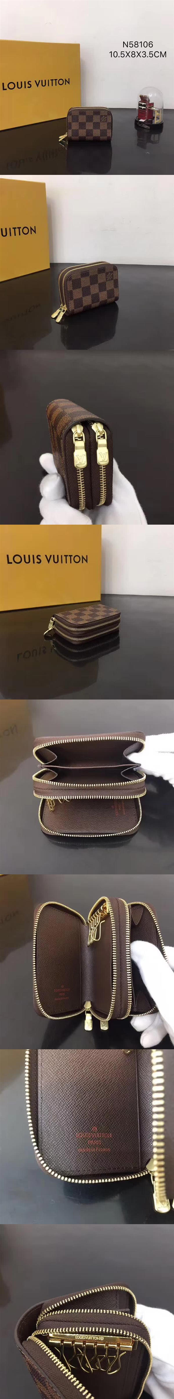路易威登/LV 零錢鑰匙包,選用 Damier 帆佈裁制而成,小巧精緻,可系扣六把鑰匙,配搭手袋或公事包既優雅又大方,款號:N58106【編號】N58106#J001【顏色】啡格【尺寸】10.5 X 8 X 3.5 cm【規格】拉鍊開合2個拉鍊隔層皮革襯裡6個鑰匙扣側貼袋2個隔層【附屬品】防塵袋