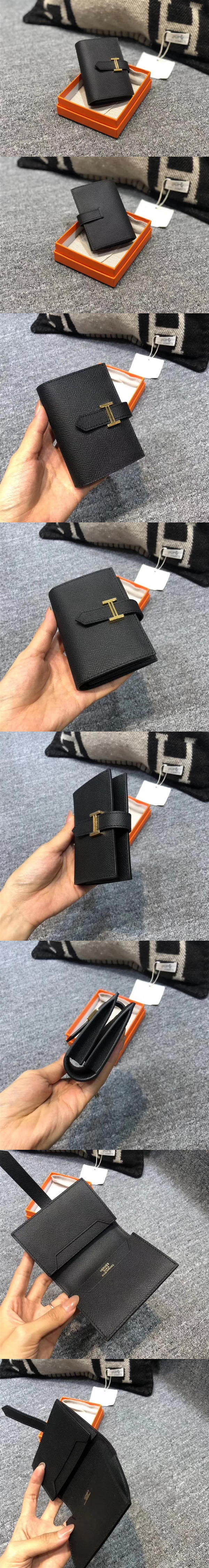 愛馬仕/Hermes Bearn 卡夾,選用手掌紋小牛皮精心裁制而成,飾以 H 鎖扣,精致優雅,易搭又好看【編號】A085【顏色】黑色【尺寸】10 X 7 cm【規格】對折開合2個大隔層2個側貼袋【附屬品】防塵袋