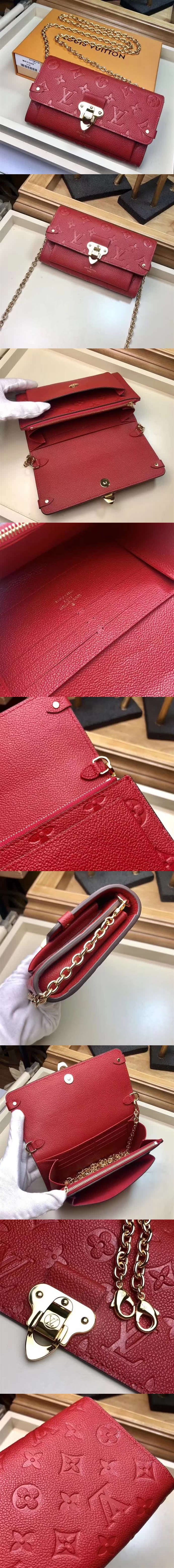 路易威登/LV CHAIN 鏈條錢夾,由柔軟的Monogram Empreinte皮革精心裁制而成,品牌傳統行李箱的設計元素化身為一枚金色鉤扣,鑲綴翻蓋,款號:M63399【編號】M63399#D518【顏色】紅色【尺寸】19 X 12 X 4 cm【規格】翻蓋開合2個隔層1個拉鏈袋1個側貼袋6個卡槽可拆卸鏈條肩帶【附屬品】防塵袋