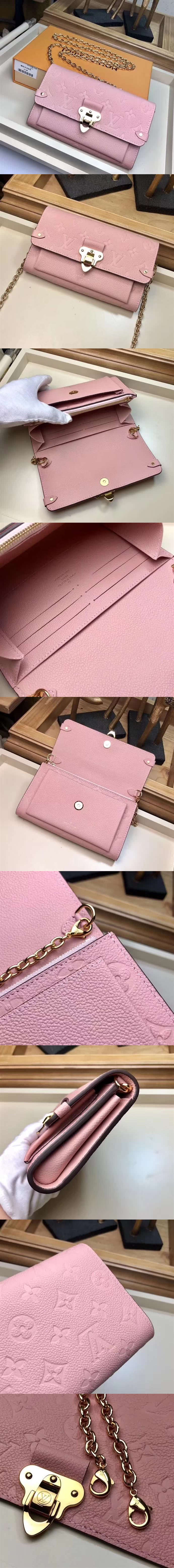 路易威登/LV CHAIN 鏈條錢夾,由柔軟的Monogram Empreinte皮革精心裁制而成,品牌傳統行李箱的設計元素化身為一枚金色鉤扣,鑲綴翻蓋,款號:M63399【編號】M63399#D518【顏色】粉色【尺寸】19 X 12 X 4 cm【規格】翻蓋開合2個隔層1個拉鏈袋1個側貼袋6個卡槽可拆卸鏈條肩帶【附屬品】防塵袋