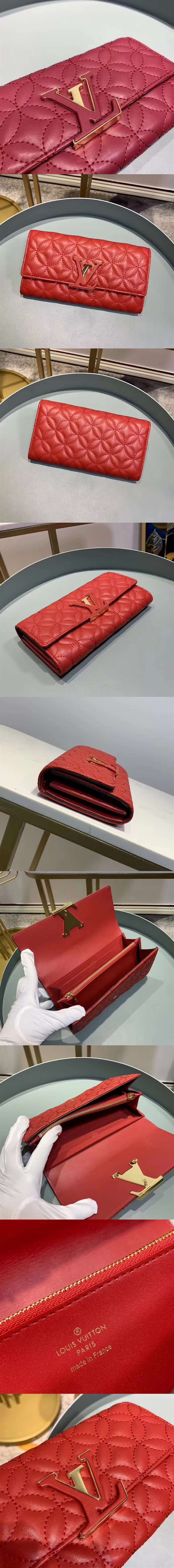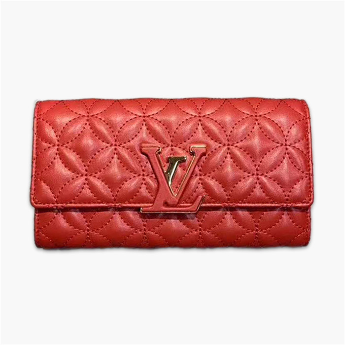 路易威登/LV CAPUCINES 錢夾,取材柔軟絎縫綿羊皮,將Monogram花卉幻化為別致紋理,輕盈LV鉤扣,即現功能性內裡,款號:M68590【編號】M68590#D518【顏色】大紅色【尺寸】20 X 11 X 2.5 cm【規格】翻蓋開合2個鈔票隔層12個卡槽1個中間拉鏈2個側貼袋【附屬品】防塵袋