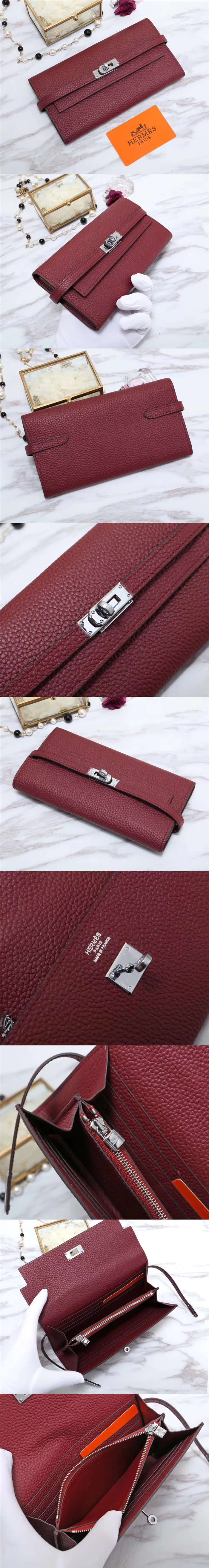 愛馬仕/Hermes kelly 錢夾,經典款式,選用荔枝紋牛皮,Kelly鎖扣,簡約輕便【編號】J049【顏色】酒紅色【尺寸】20 X 11 cm【規格】銀色Kelly鎖扣翻蓋開合2個鈔票隔層1個拉鏈袋1個側貼袋12個卡槽【附屬品】防塵袋