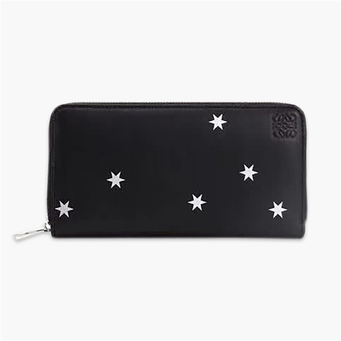 羅意威/Loewe 長款錢夾,選用經典小牛皮精制而成,銀色六芒星運用皮革鑲嵌工藝粘貼,閃耀在黑色包身上,宛如群星璀璨的夜空,完美演繹精湛工藝,款號:281703【編號】281703#C025【顏色】黑色【尺寸】19 X 11 X 2.5cm【規格】拉鏈開合2個鈔票隔層8個卡槽1個拉鏈袋2個側貼袋【附屬品】防塵袋