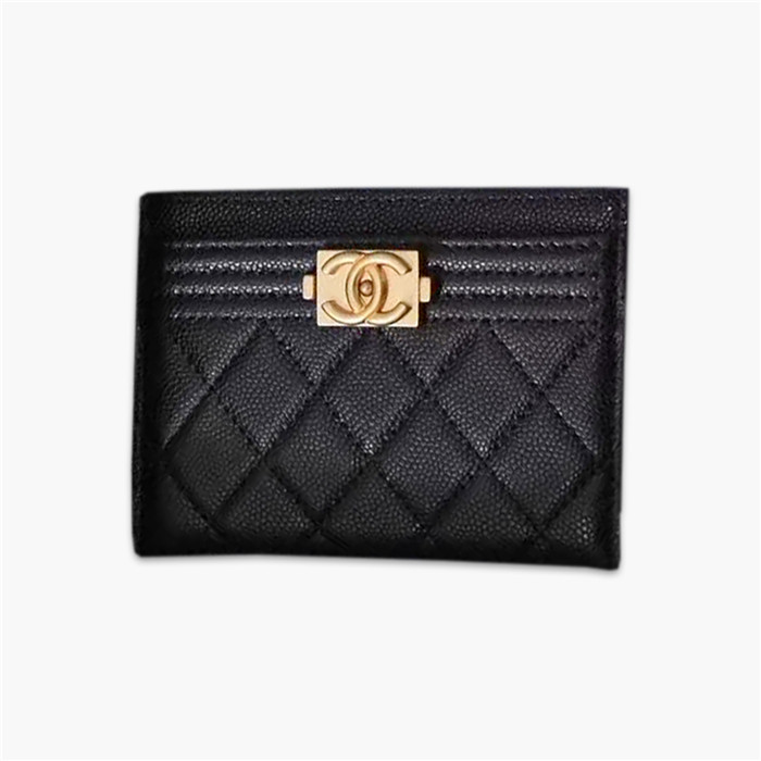 香奈兒Chanel 卡夾,選用小顆粒球紋牛皮搭配做舊五金,配以菱紋刺繡,三條邊骨,精致耐磨,時尚美觀大方,方便攜帶,款號:31510【編號】31510#H028【顏色】黑色【尺寸】11 X 7.5 cm 【規格】雙C徽標金色金屬件1個中間夾層3個卡槽【附屬品】防塵袋
