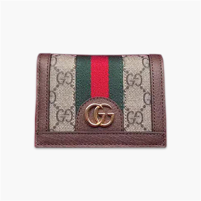 古馳Gucci 對折錢夾,采用人造帆佈搭配皮革精制而成,點綴綠紅綠條紋織帶飾以雙G徽標,簡單大方,款號:523155【編號】523155#C112【顏色】啡/棕【尺寸】11cm(長)x8.5cm(高)x3cm(寬)【規格】雙G金屬徽標金色五金配件1個拉鏈袋1個鈔票隔層2個側貼袋4個卡槽摁扣開合【附屬品】防塵袋