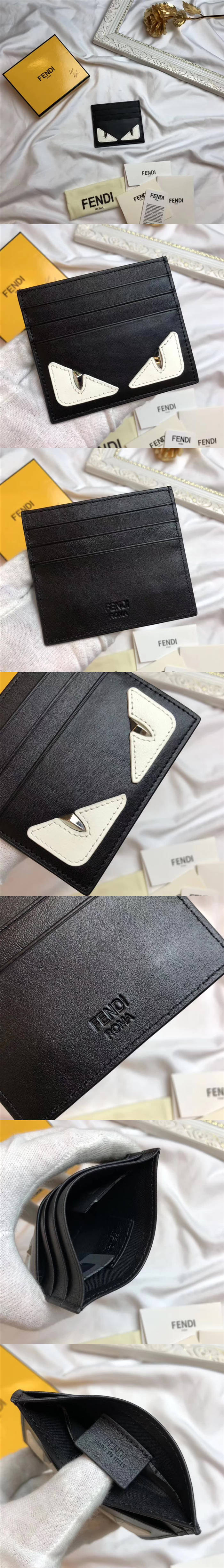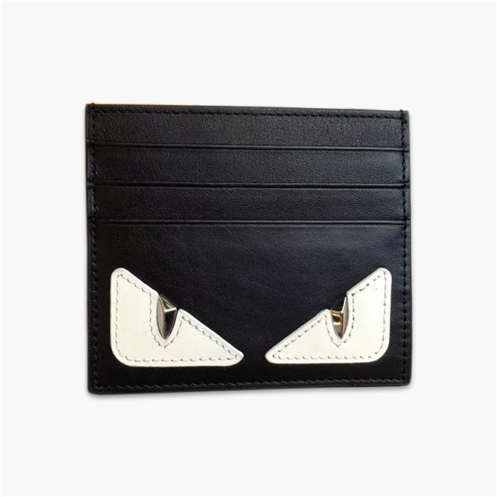 芬迪/Fendi 卡夾,采用小牛皮制成,白色皮革搭配鋼釘鑲嵌,呈現眼睛圖案,款號:7M0164【編號】7M0164#A359【顏色】黑色/白眼【尺寸】10.5cm(長)X8(高)【規格】Fendi燙印徽標棉麻裡襯1個中間袋6個卡槽【附屬品】防塵袋