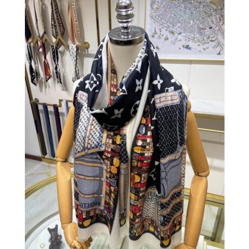 高仿LV羊絨長巾點綴著由路易威登硬箱環繞的趣味牛圖案,邊緣飾有一排排繁復的鈴鐺圖案,強烈推薦
