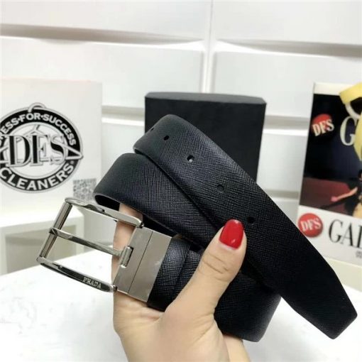 高仿普拉達Prada2020新款男士皮帶,黑色真皮十字紋腰帶,配以新款LOGO針扣式帶扣腰為黑色小牛皮帶